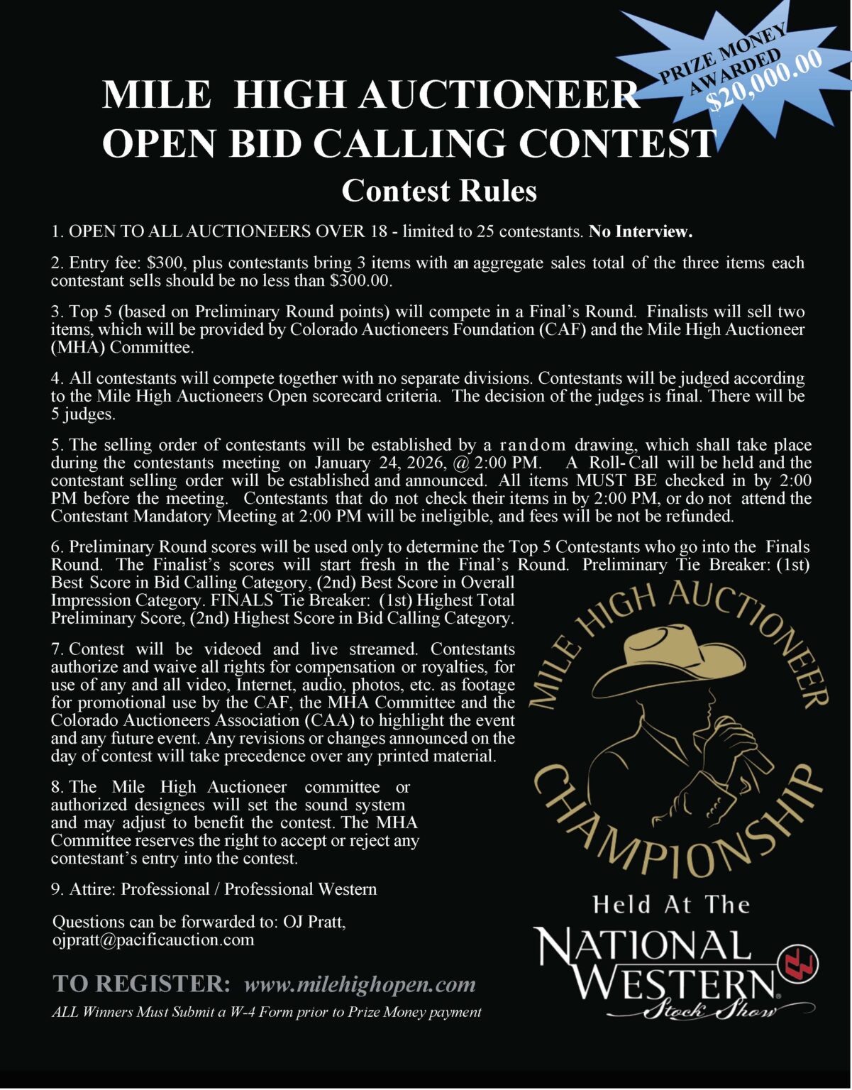 Contestants authorize and waive all rights for compensation or royalties, for use of any and all video, internet, audio, photos, etc as footage for promotional use by the Colorado Auctioneers Foundation, the Mile High Auctioneer Committee and the Colorado Auctioneers Association to highlight the event and any future event.